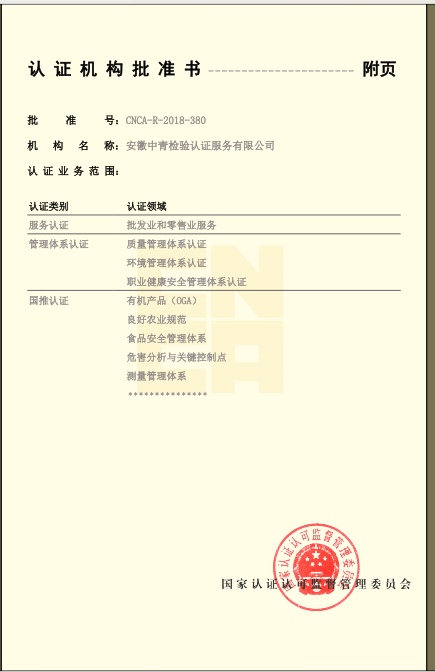 安徽省“食安安徽”品牌認證:評價是根據國際通行的合格評定方式,依據“食安安徽”品牌認證評價標準及相關規(guī)定,對申請“食安安徽”認證評價的食品生產經營者和特定區域進行的第三方認證評價活動。“食安安徽”品牌認證評價標準包括企業認證和區域評價兩大類,企業認證對象包括食用農產品生產者、食品生產企業、食品流通企業、餐飲服務企業,區域評價對象包括食品生產基地、食品生產園區、餐飲安全街區、食品安全小鎮、安徽省食品安全示范縣(市、區)。
